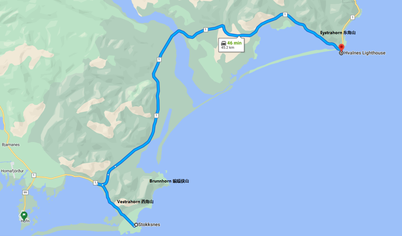 下面的图标注了西角山 Vestrahorn,蝙蝠侠山 Brunnhorn 和东角山 Eystrahorn 的位置。从西角山开车到东角山大概 45 公里。蝙蝠侠山就在西角山后面,因为形状酷似蝙蝠侠的头盔而得名。